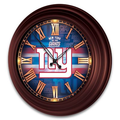 $145 New York Giants NFL Outdoor Illuminated Atomic Wall Clock Featuring A Glass-Encased Face With Roman Numerals, Team Colors & Logos – From the very first hike, to the final touchdown, every second of a football game is crucial. So, if you want perfect timekeeping with unfailing self-setting accuracy, there’s no greater champion than the atomic clock. And now there’s one designed just for New York football fans. Introducing, the New York Giants Wall Clock, a limited-edition atomic clock officially licensed by NFL Properties LLC and available only from The Bradford Exchange.Measuring over a foot in diameter, this first-of-its-kind indoor/outdoor clock displays the team’s official logos, colors and year of establishment on a smart field with the look of jersey texturing. In sync via radio waves with the official source of U.S. time in Fort Collins, Colorado, your New York Giants clock is completely self-setting, even during Daylight Saving Time. And hidden LED lights, activated by a built-in sensor that detects darkness, automatically illuminate the glass-encased face and Roman numerals. Plus, the clock’s stylish housing is crafted of copper-toned metal for weather resistant durability, making it a great complement to your outdoor NFL decor too. Strong demand is anticipated, so don’t wait. Order now!
