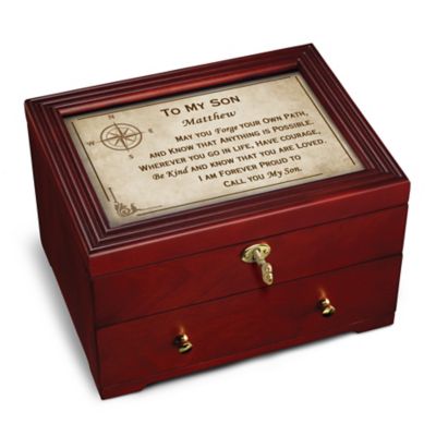$119.99 Personalized Jewelry – Your son fills your heart with so much joy. Now, you can let him know just how much you care about him with the To My Son Personalized Keepsake Box, available exclusively from The Bradford Exchange. This handsome strongbox provides a smart solution for organizing your son’s jewelry, money, keys, important documents and more. Dresser-top clutter is a thing of the past when you present him with this sturdy, lockable wooden box personalized with his name and an inspiring message encouraging him to be true to himself and follow his own path.Custom-crafted to our exacting standards, this substantial, cherry-finished wooden strongbox features generous storage space inside its felt-lined interior. More than just a jewelry box, it includes an upper storage compartment and a slide-out drawer with brass-plated fittings to compartmentalize his valuables as well as important documents. The functional brass lock and key attractively keep his treasures secure and out of sight. What a wonderful gift for any occasion celebrating your son – perfect as a graduation gift, birthday gift and more! Strong demand is expected for this handsome and meaningful keepsake box, so don’t delay. Order now!